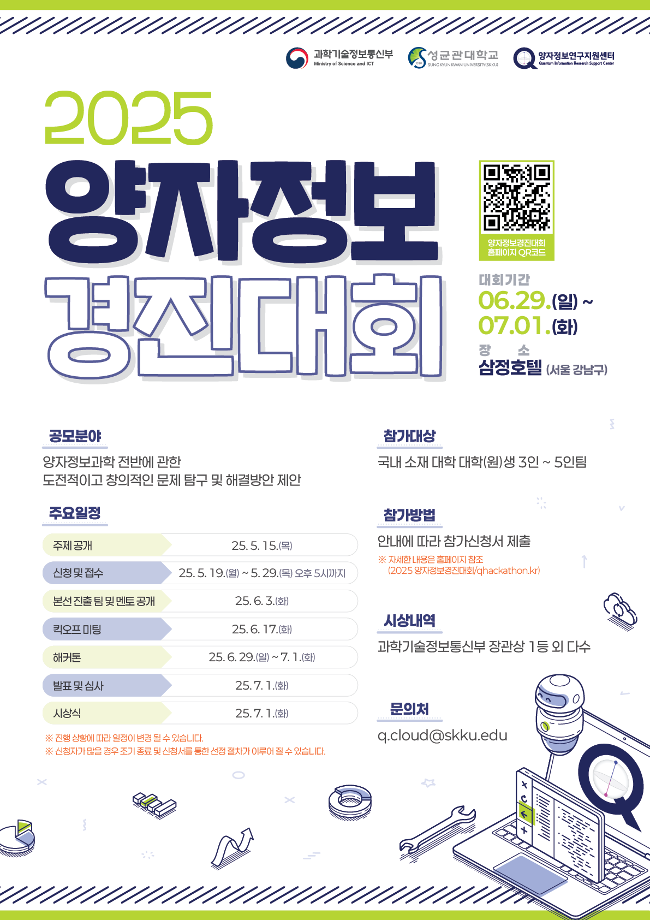 과학기술정보통신부가 주최하는 [퀀텀코리아 2025]를 맞이하여 성균관대학교 양자정보연구지원센터에서는 양자정보분야 국내 경쟁력 강화 및 저변확대를 위해 개최되는 「2025 양자정보경진대회(해커톤)」의 참가자를 다음과 같이 모집합니다.