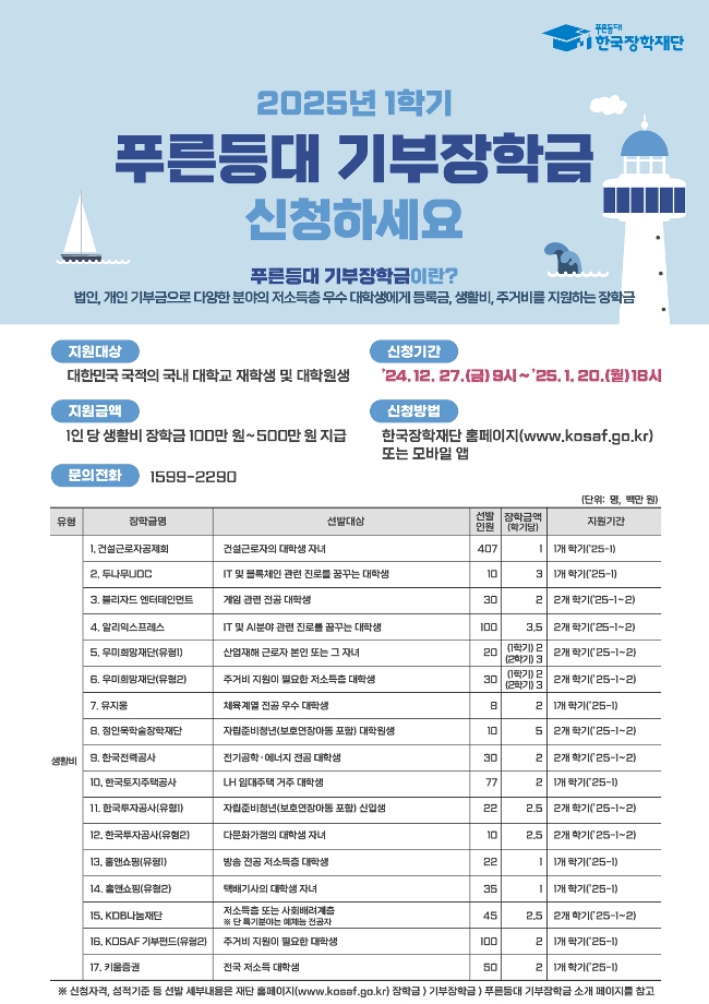 [한국장학재단] 2025년 1학기 푸른등대 기부장학금 신청 홍보
