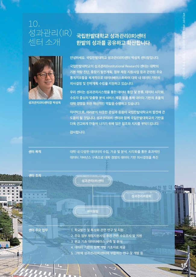 □ 박성욱 성과관리(IR)센터장은 “이번 성과자료집 발간을 통해 대학의 핵심적 가치인 혁신적 연구, 글로벌 교육, 사회적 기여 등을 보다 효과적으로 공유하고 앞으로도 지속 가능한 발전을 위한 기반을 다져나갈 계획이며, 성과자료집은 교내 구성원들과 외부 관계자들에게 배포하여 대학의 성과를 공유·확산시킬 예정이다”라고 전했다.