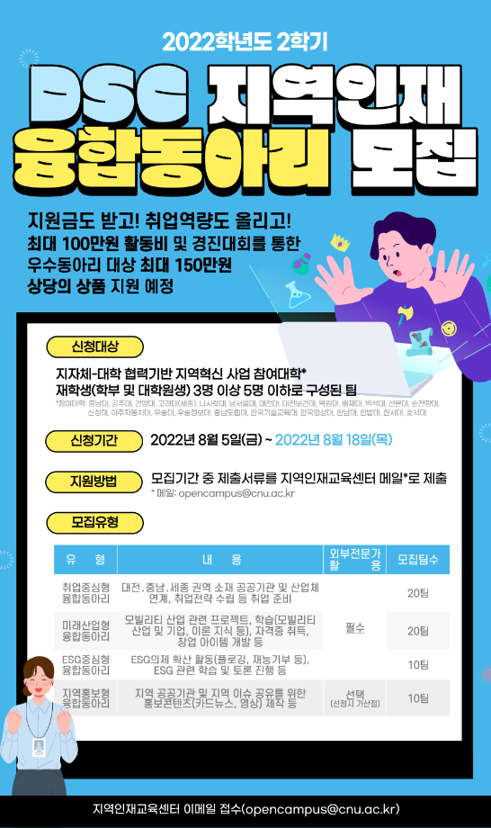 2022학년도 2학기 DSC 지역인재 융합동아리 운영 계획을 다음과 같이 알려드리니, 관심있는 학생들의 참여 바랍니다.