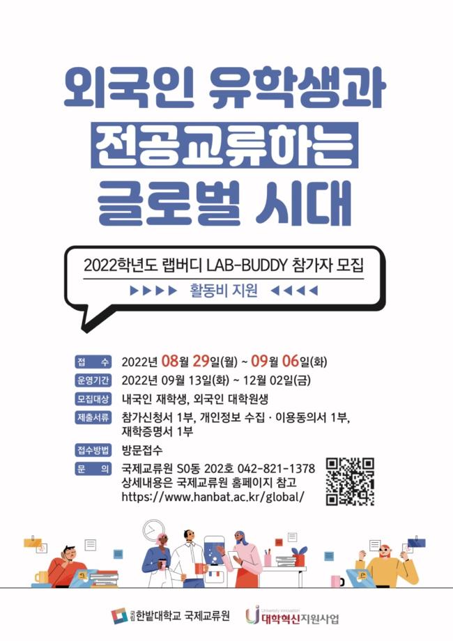 국제교류원에서는 내국인 재학생과 외국인 유학생 간 교류의 기회를 제공하고 타문화에 대한 이해와 존중, 외국인 유학생의 한국유학생활 적응, 전공교류 등 국제적 사고 함양을 위해 버디, 랩버디 프로그램을 추진하고자 하오니 관심있는 학생은 참여바랍니다.