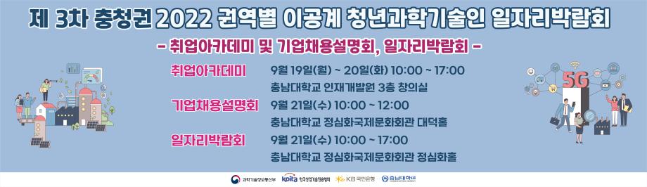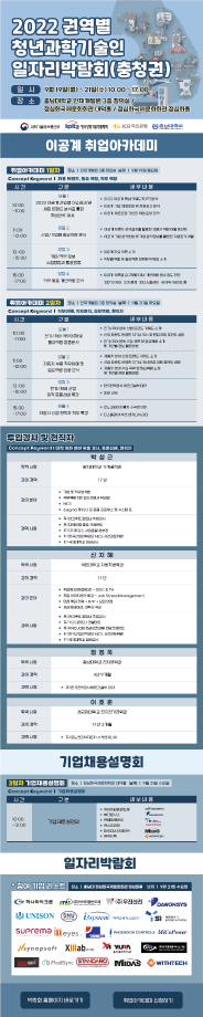 이공계 취업준비생들의 취업역량 강화를 위하여 2022년「이공계 취업아카데미·권역별 청년과학기술인 일자리박람회」를 다음과 같이 개최하고자 하오니, 관심있는 학생들은 참여바랍니다.