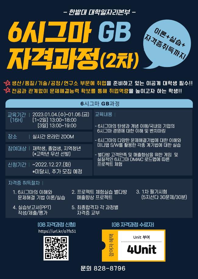 2022학년도 6시그마 GB 자격과정(2차)을 아래와 같이 운영하오니 관심 있는 학생들은 참여바랍니다.
