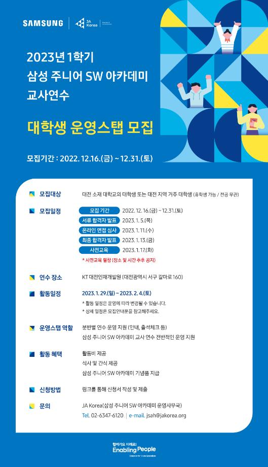 위와 관련하여 2023년 1학기 「삼성 주니어 SW 아카데미」 교사연수 진행을 보조할 대학생 운영스탭을 다음과 같이 모집하오니 많은 관심과 참여 부탁드립니다.