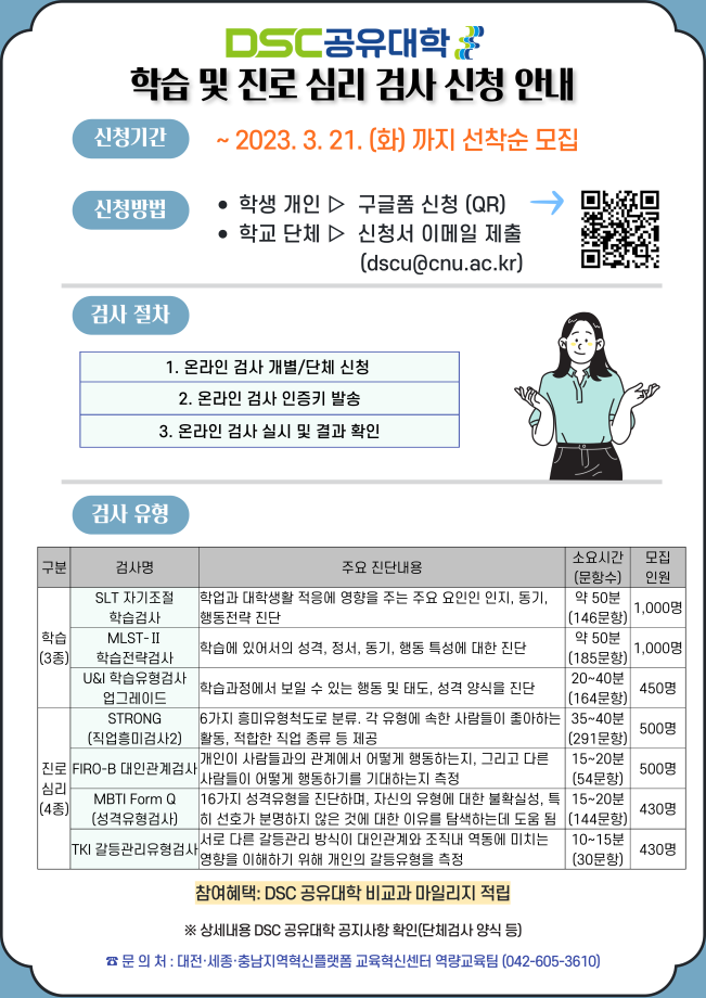 대전·세종·충남지역혁신플랫폼 교육혁신센터에서는 DSC 공유대학 24개 참여대학 재학생들을 대상으로‘학습 및 진로 심리검사’를 운영하고자 합니다. 관심 있는 학생들은 참여바랍니다.
