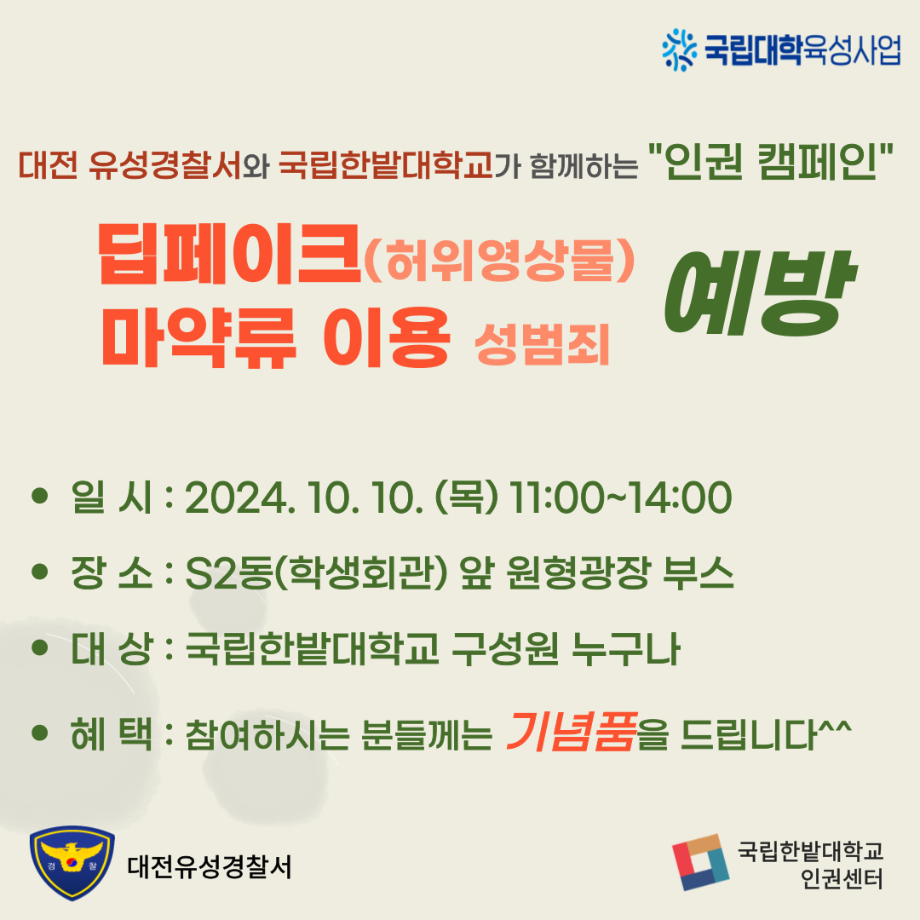 인권센터에서는 캠퍼스 내 인권친화문화조성을 위한 "인권 캠페인"을 대전유성경찰서와 연계하여 운영하오니 많은 참여와 관심 바랍니다.